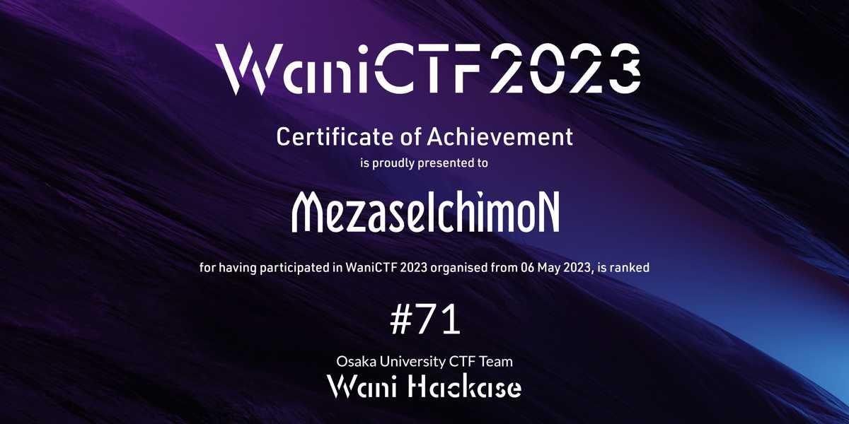 Wani CTF 2023 参加 (結果, 71 / 840 teams)